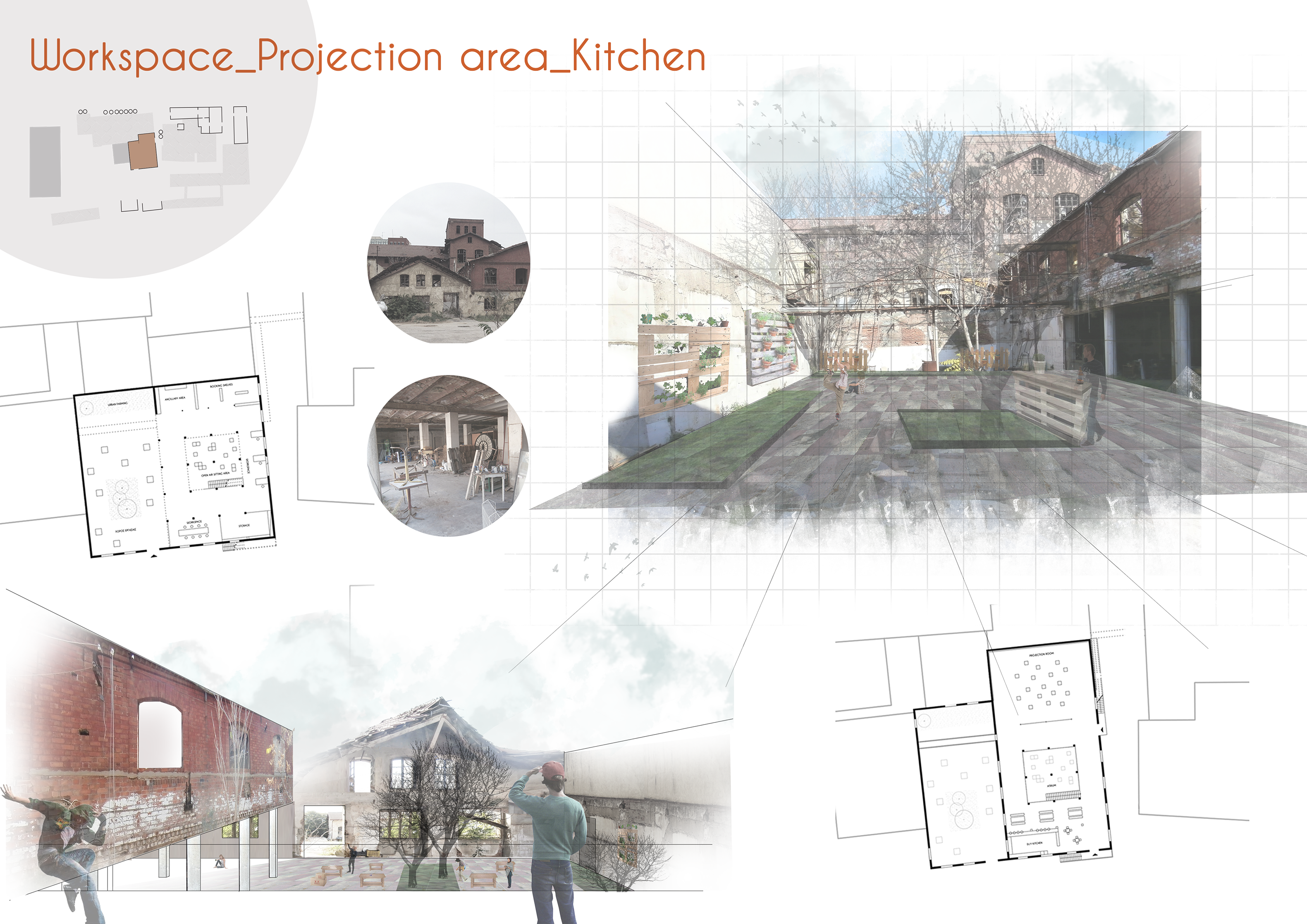 The voyage of creative recycling continues over a bridge in the second upper floor to the self-service café/canteen with vegetation, urban farming and outdoor-seating. It finds place in two adjacent brick buildings that overlook the nearby Plaza and martket. The ruined building remains roof-less and acts as a semi-outdoor space, while a cut in the neighbouring building brings natural daylight into the depth of the building. It also contains private workstations, a library and cinema. Throughout the design proposal, the dominant brick architecture is preserved.