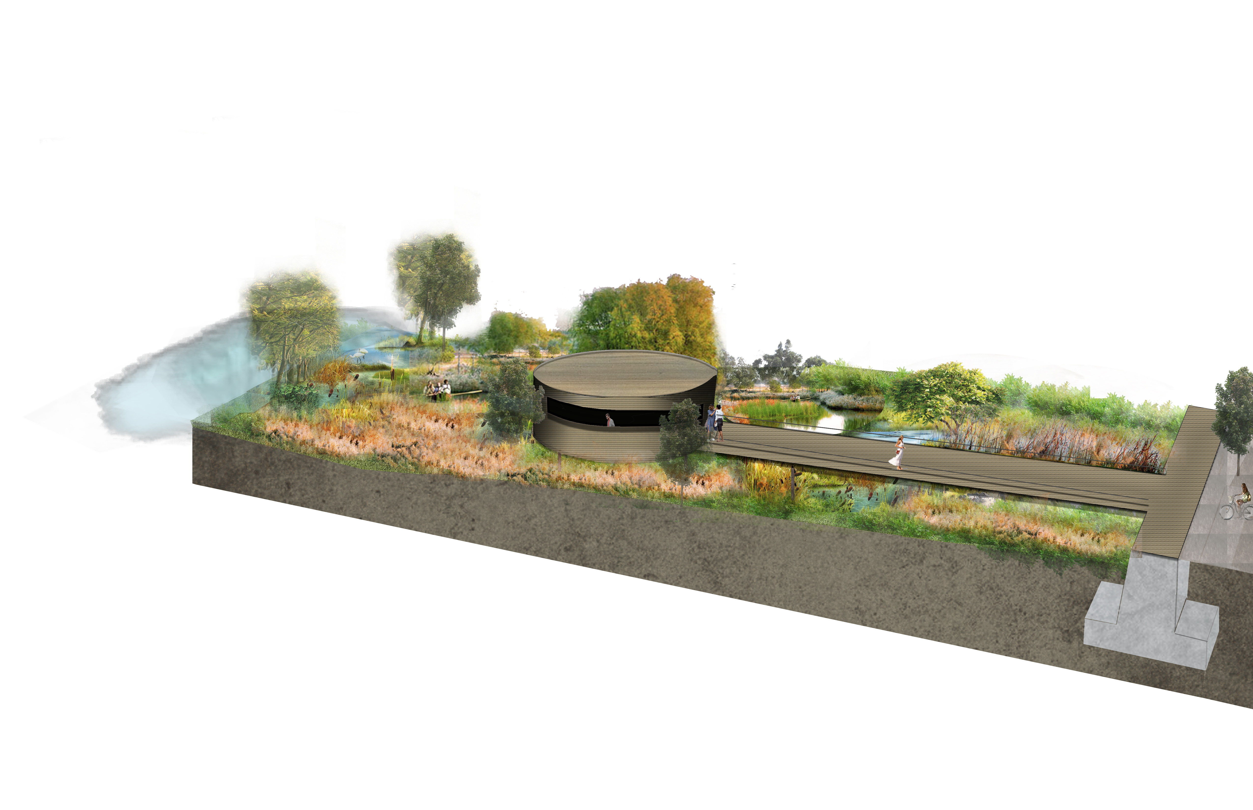 The plan aims to allow Alameda Point to return to nature. Wetlands will mitigate sea level rise, provide a biodiverse sanctuary, a boardwalk park, and highlight views of the bay.